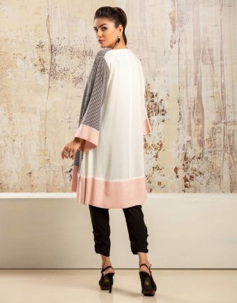 Black and white, colour blocked summer linen shirt with pink grip silk borders, in a flared cut design