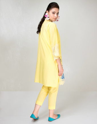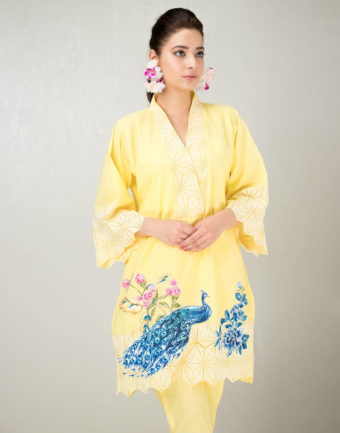 Yellow cotton lawn shirt with embroidered applique motifs and lace detialing at hem, sleeves and neck