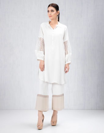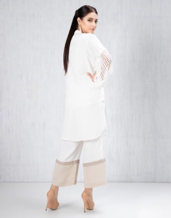 White grip silk shirt with lace adorned sleeves and pearl button detailing accompanied by white and beige colour block pants in grip silk