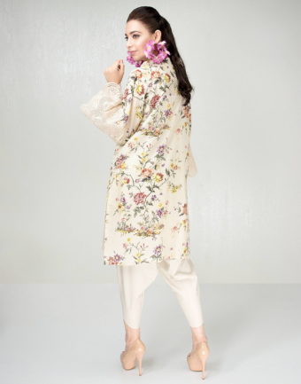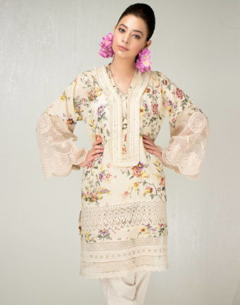 Beige printed cotton lawn shirt with lace applique on sleeves, neck and hem and pearl button detailing