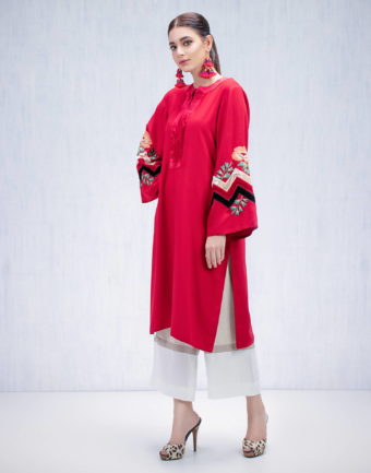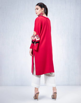 Red Linen shirt with velvet patchwork and embroidered floral motifs