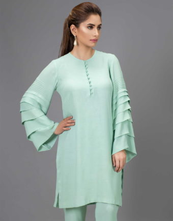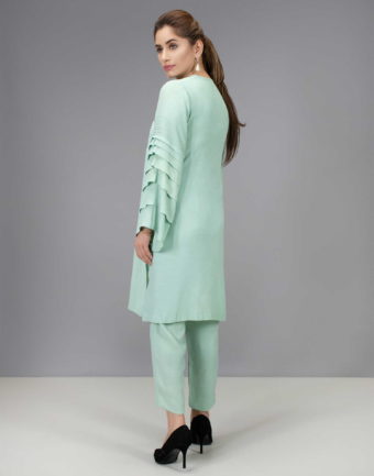 Mint green grip silk shirt in a pleated sleeve design with round button detailing accompanied by mint green grip silk capri style pants