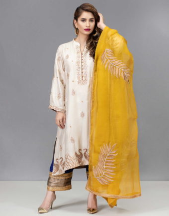 Yellow mustard pure georgette flared shirt with golden work on the yoke and maroon jamawar finishing on the hem. Accompanied with grip silk pants.