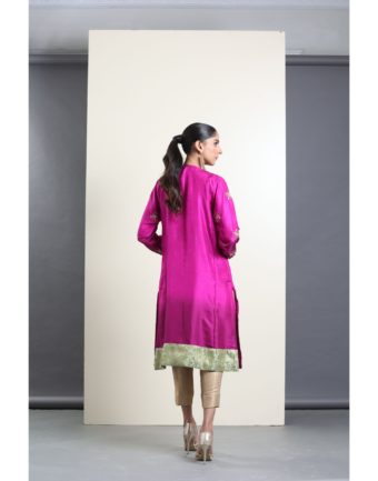 Shaded pink shirt in raw silk with ‘tilla’ work on the front and sleeves and green jamawar patti to finish