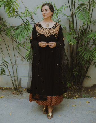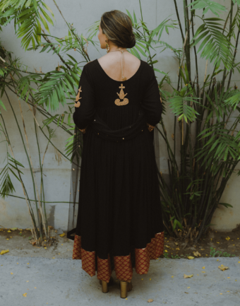 Black grip flared shirt with gold ‘marorri’ work on the yoke , sleeves and back, maroon jamavar finishing on the hem accompanied with black grip flared pants/azaar