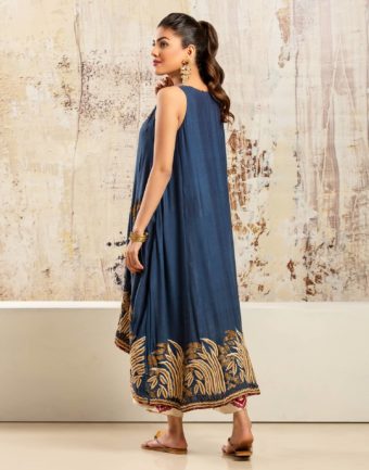 Midnight blue asymetrical cotton net shirt with embroidered and hand worked border and motifs, and block printed detailing at inner hem