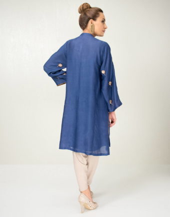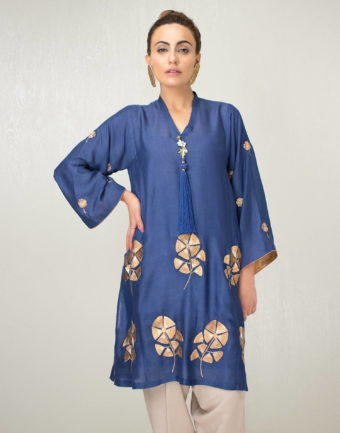 Indigo blue cotton net shirt with gold zarri embroidery and large tassel detailing