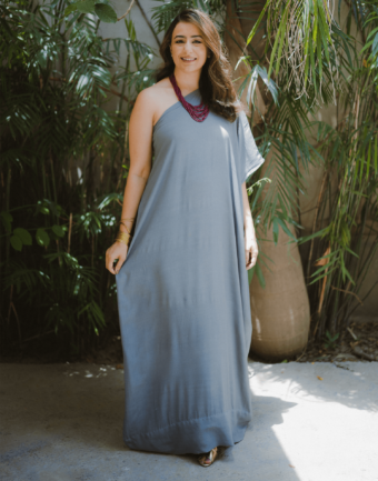 Grey grip silk one shoulder long dress with a slit