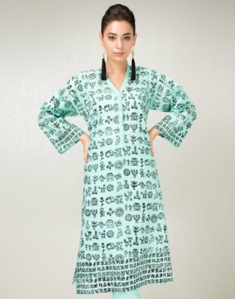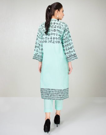 Sea Green cotton lawn kurta with block printed motifs and pearl button detailing