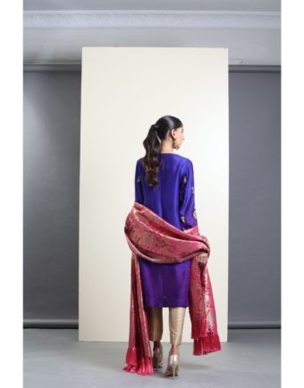 Purple raw silk shirt with ‘gota and tilla’ work on the front and sleeves and shaded jamawar border on the hem to finish